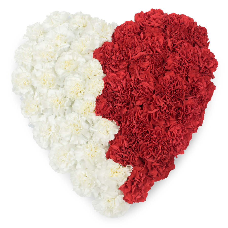 Presenting our Beautiful Mixed Carnation Heart Bouquet, a perfect blend of elegance and sentiment. This exquisite arrangement showcases a vibrant mix of white and red carnations, chosen for their superior quality and stunning appearance.