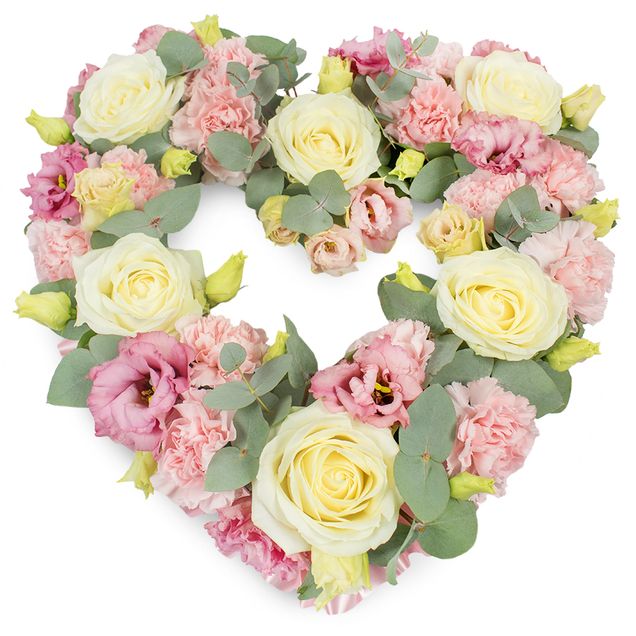 Honor the memory of loved ones with our Refined Open Heart Memorial Bouquet. This elegant arrangement showcases a perfect blend of white roses, pink carnations, pink lisianthus, and eucalyptus leaves, meticulously arranged in the shape of an open heart.